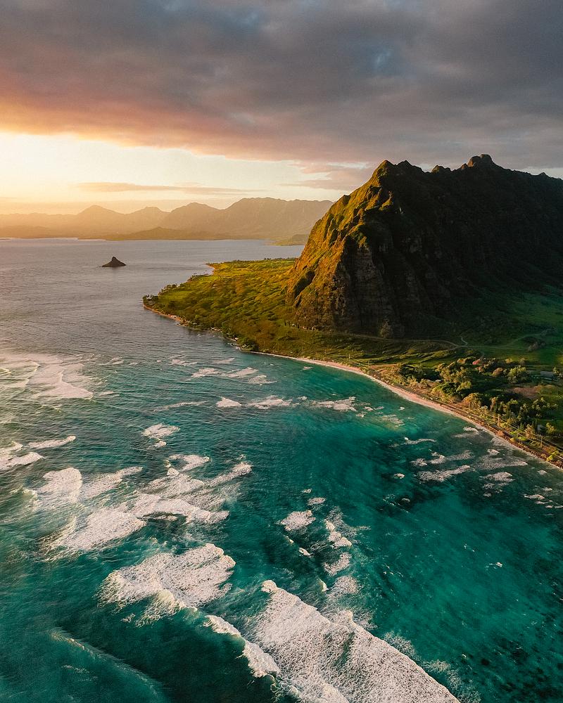 Drone shot of a ridge along the ocean with golden light highlighting the mountain. Oahu, Hawaii.