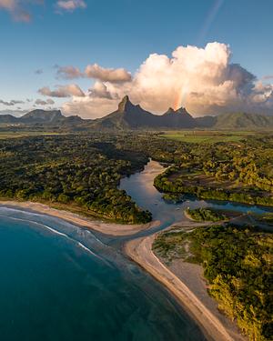 Drone shot of Tamarin beach in Mauritius. In the distance a rainstorm recedes behind Rempart Mountain and a rainbow emerges.