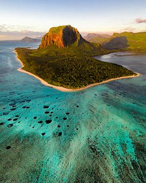 Golden Light strikes Le Morne Brabant and illuminates the beautiful shades of blue in the ocean. Drone image. Le Morne, Mauritius.