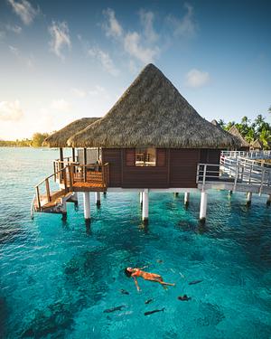 Floating in turquoise waters with curious fish swimming around. Rangiroa, French Polynesia.