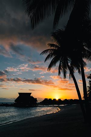 Bungalows and palms are silhouetted against the colorful sunset sky. Rangiroa, French Polynesia.