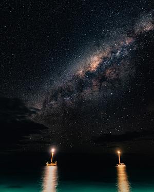 The Milky Way shows off over the ocean with two small sailboats twinkling in the distance. Rangiroa, French Polynesia.